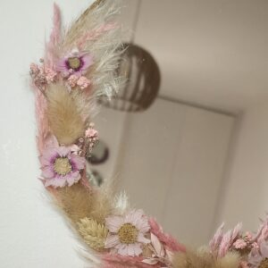 Ajoutez une touche audacieuse et florale à votre intérieur avec ce miroir unique orné de fleurs séchées dans une palette vibrante de bordeaux, violet intense et rose fuchsia. Une pièce forte en caractère, qui apporte élégance et dynamisme à votre décoration, tout en conservant une atmosphère naturelle et raffinée.