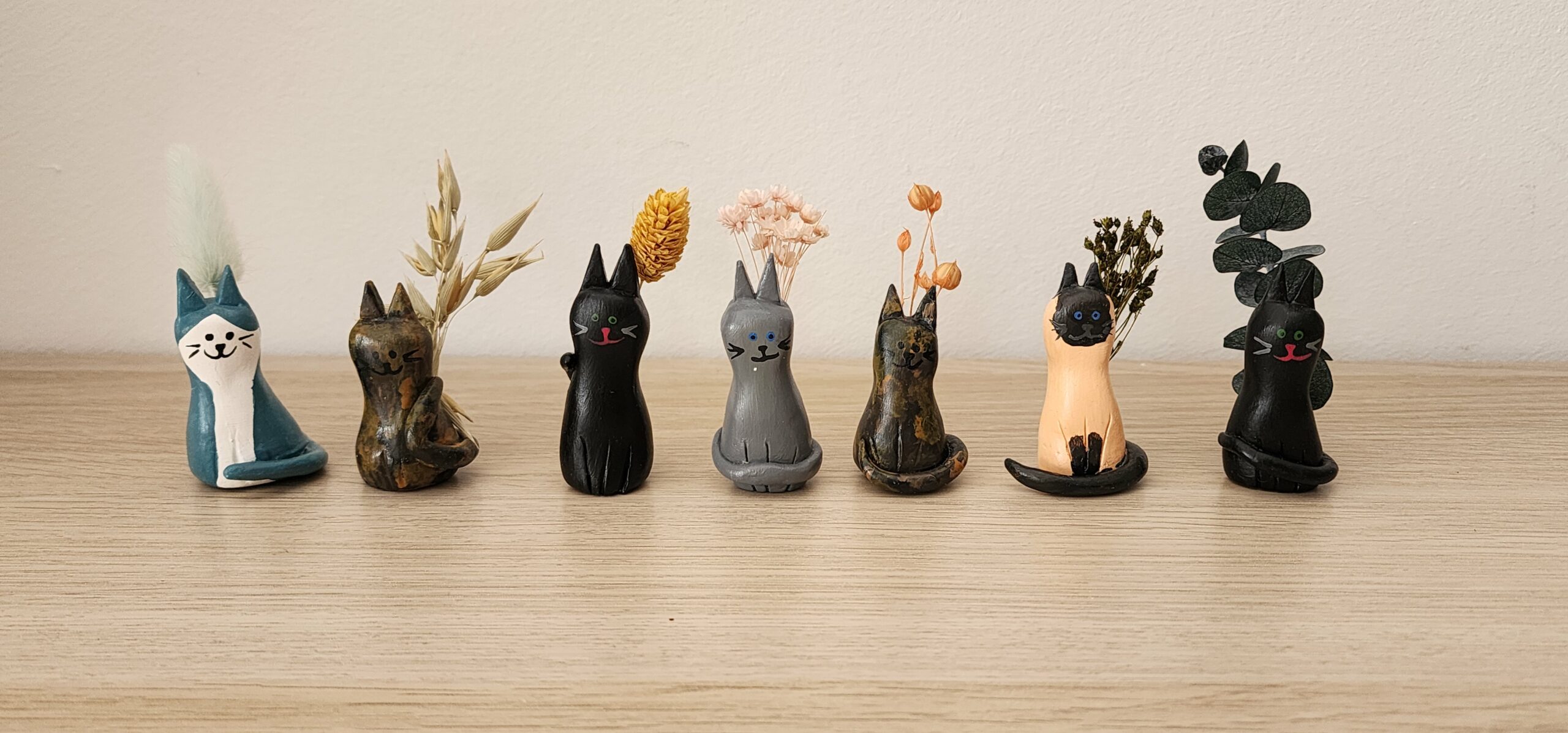 Apportez une touche délicate et poétique à votre intérieur avec ces chats en argile décorés de fleurs séchées et stabilisées. Entièrement réalisés à la main, chaque chat est une pièce unique, façonnée et fleurie avec soin dans mon atelier.